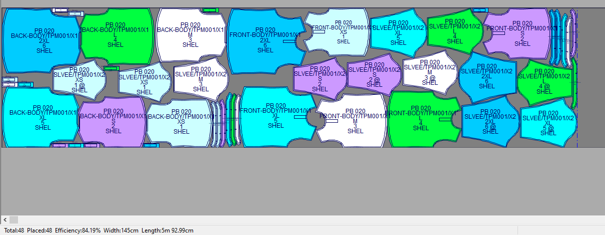 Pada contoh ini marker penggunaan bahan kain yang paling efisien dengan menggunakan 6 gambar pola (ukuran: XS, S, M, L, XL, 2XL) adalah 468cm dengan tingkat efisiensi sebesar 87.96%.