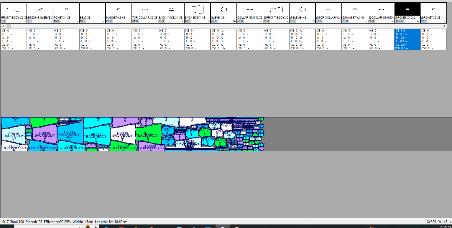 Pada contoh ini marker penggunaan bahan kain yang paling efisien dengan menggunakan 6 gambar pola (ukuran: XS, S, M, L, XL, 2XL) adalah 468cm dengan tingkat efisiensi sebesar 87.96%.