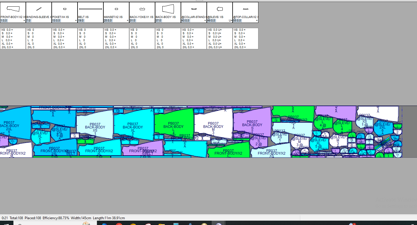 Pada contoh ini marker penggunaan bahan kain yang paling efisien dengan menggunakan 6 gambar pola (ukuran: XS, S, M, L, XL, 2XL) adalah 468cm dengan tingkat efisiensi sebesar 87.96%.