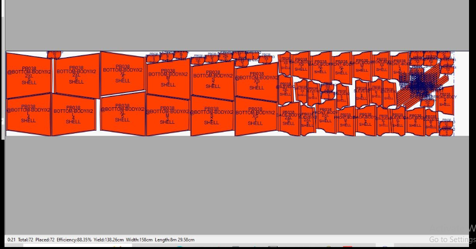 Pada contoh ini marker penggunaan bahan kain yang paling efisien dengan menggunakan 6 gambar pola (ukuran: XS, S, M, L, XL, 2XL) adalah 468cm dengan tingkat efisiensi sebesar 87.96%.
