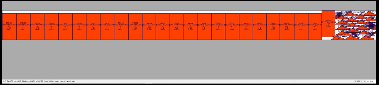 Pada contoh ini marker penggunaan bahan kain yang paling efisien dengan menggunakan 6 gambar pola (ukuran: XS, S, M, L, XL, 2XL) adalah 468cm dengan tingkat efisiensi sebesar 87.96%.