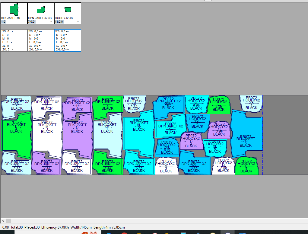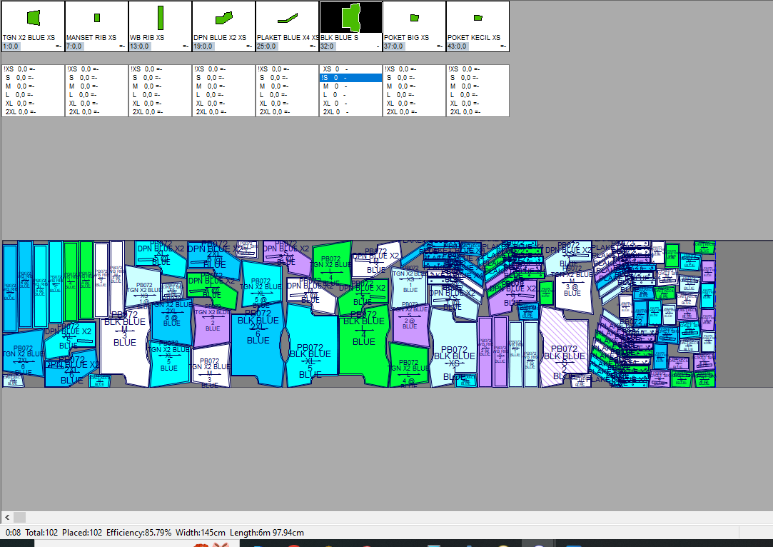 Pada contoh ini marker penggunaan bahan kain yang paling efisien dengan menggunakan 6 gambar pola (ukuran: XS, S, M, L, XL, 2XL) adalah 468cm dengan tingkat efisiensi sebesar 87.96%.
