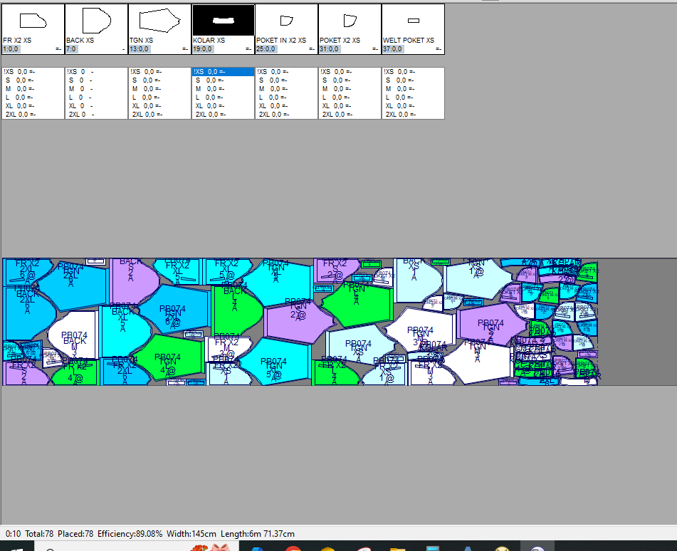 Pada contoh ini marker penggunaan bahan kain yang paling efisien dengan menggunakan 6 gambar pola (ukuran: XS, S, M, L, XL, 2XL) adalah 468cm dengan tingkat efisiensi sebesar 87.96%.