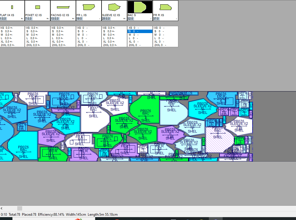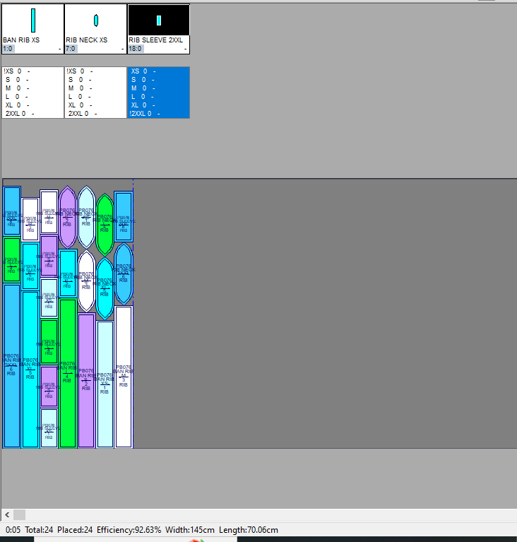 Pada contoh ini marker penggunaan bahan kain yang paling efisien dengan menggunakan 6 gambar pola (ukuran: XS, S, M, L, XL, 2XL) adalah 468cm dengan tingkat efisiensi sebesar 87.96%.
