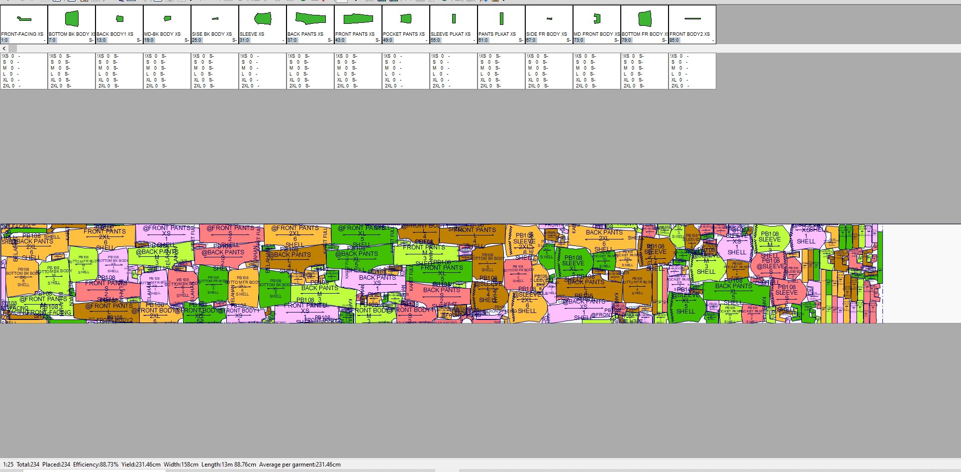 Pada contoh ini marker penggunaan bahan kain yang paling efisien dengan menggunakan 6 gambar pola (ukuran: XS, S, M, L, XL, 2XL) adalah 468cm dengan tingkat efisiensi sebesar 87.96%.