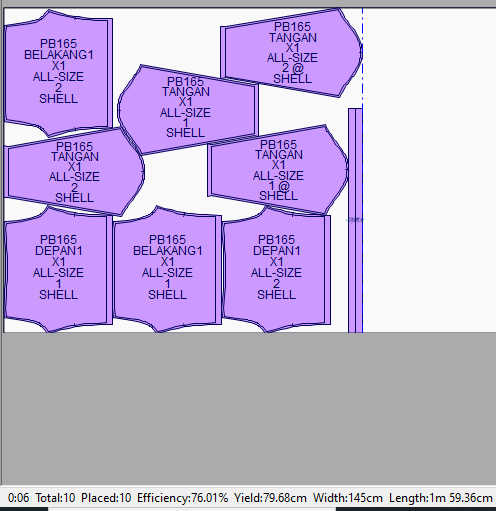 Pada contoh ini marker penggunaan bahan kain yang paling efisien dengan menggunakan 6 gambar pola (ukuran: XS, S, M, L, XL, 2XL) adalah 468cm dengan tingkat efisiensi sebesar 87.96%.