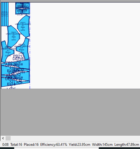 Pada contoh ini marker penggunaan bahan kain yang paling efisien dengan menggunakan 6 gambar pola (ukuran: XS, S, M, L, XL, 2XL) adalah 468cm dengan tingkat efisiensi sebesar 87.96%.