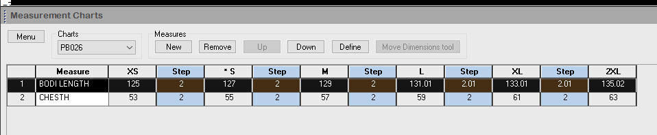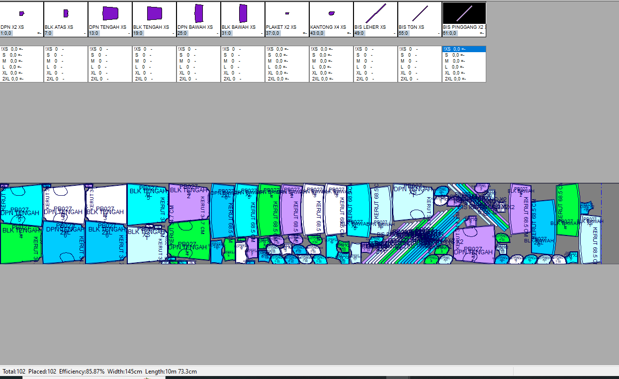 In this example the most efficient use of fabric base on the layout of 6 pattern drawing (sizes: XS, S, M, L, XL, 2XL) is 468cm with efficiency at 87.96%.