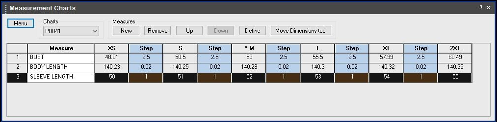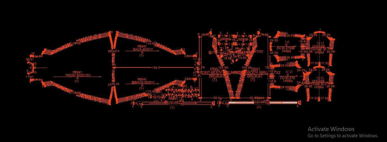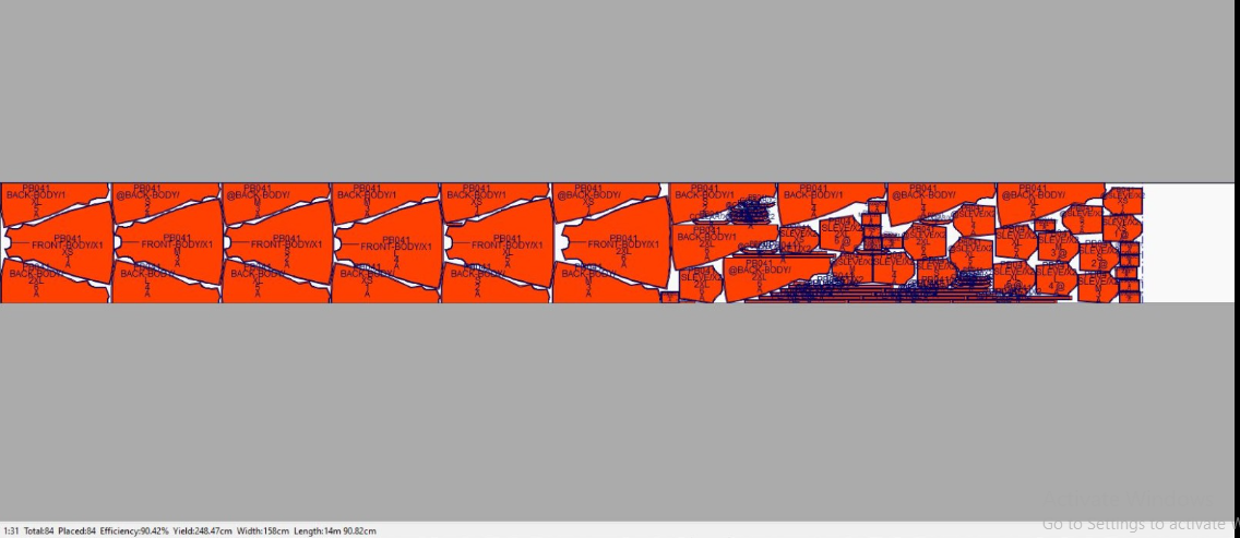 In this example the most efficient use of fabric base on the layout of 6 pattern drawing (sizes: XS, S, M, L, XL, 2XL) is 468cm with efficiency at 87.96%.