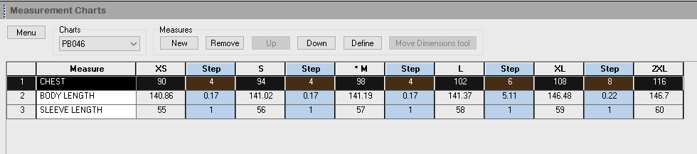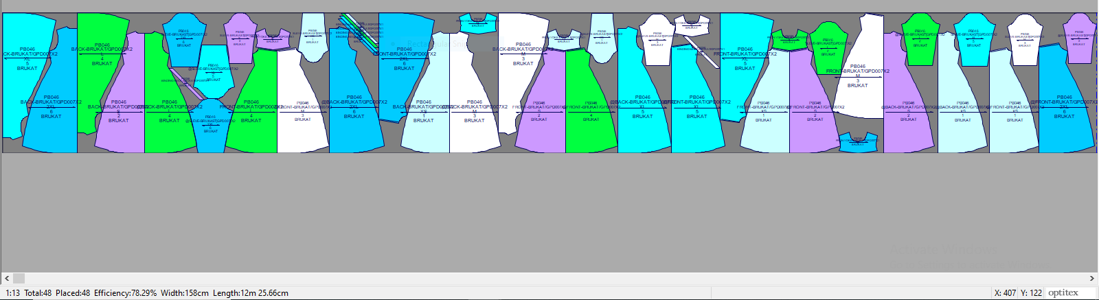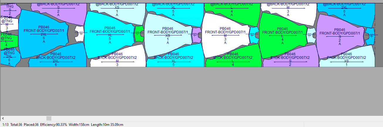 In this example the most efficient use of fabric base on the layout of 6 pattern drawing (sizes: XS, S, M, L, XL, 2XL) is 468cm with efficiency at 87.96%.