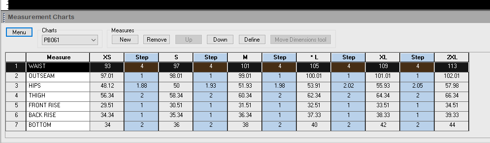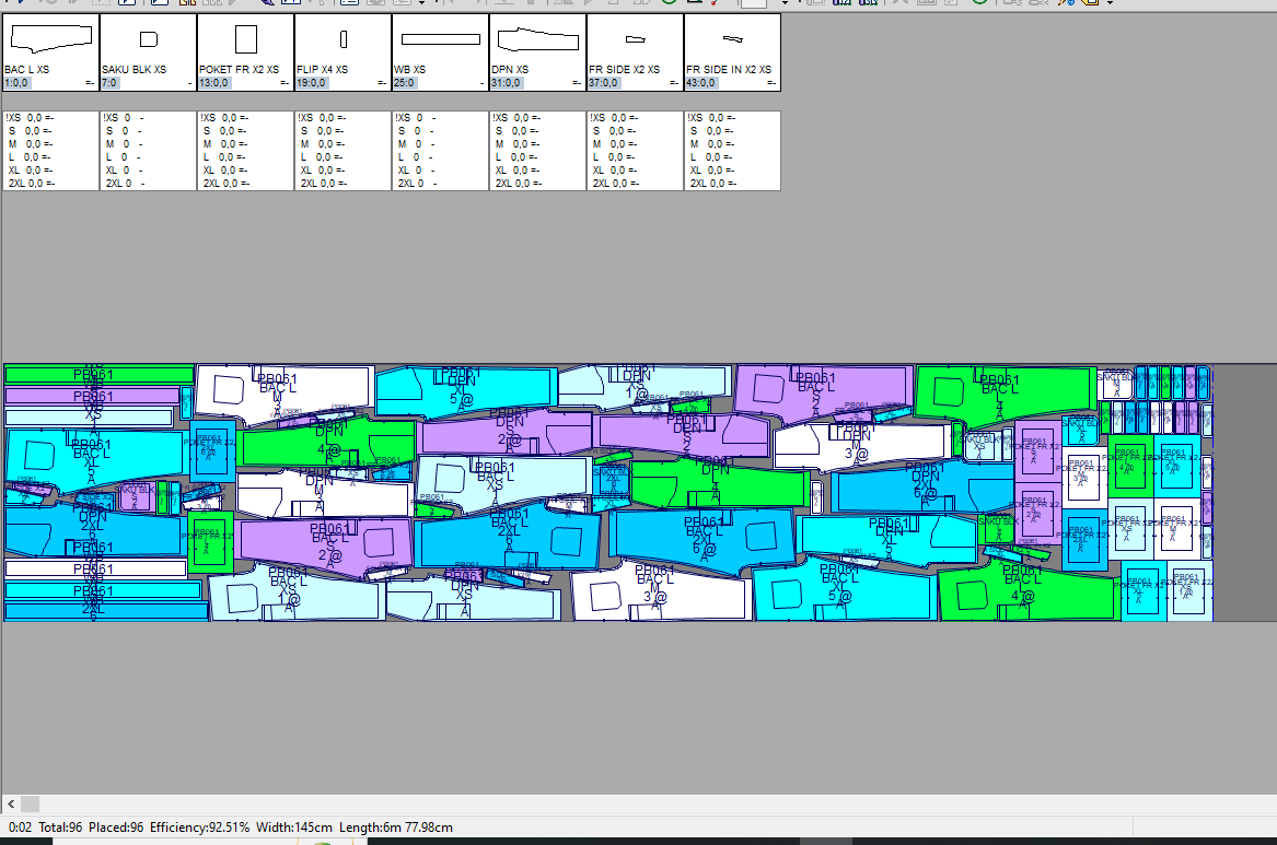 In this example the most efficient use of fabric base on the layout of 6 pattern drawing (sizes: XS, S, M, L, XL, 2XL) is 468cm with efficiency at 87.96%.