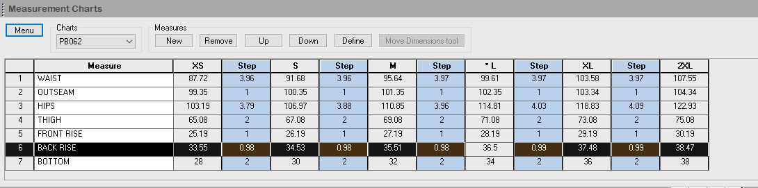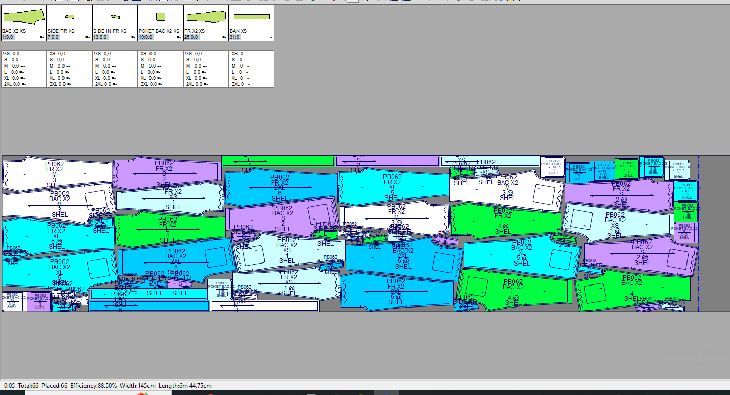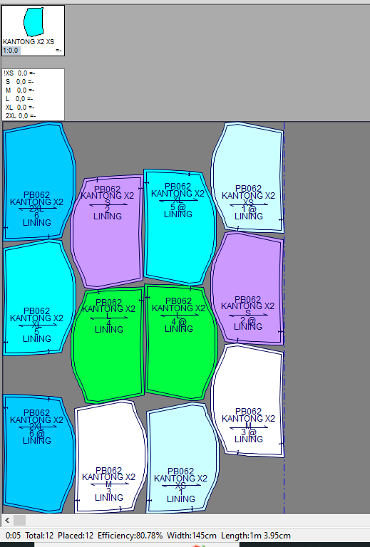 In this example the most efficient use of fabric base on the layout of 6 pattern drawing (sizes: XS, S, M, L, XL, 2XL) is 468cm with efficiency at 87.96%.