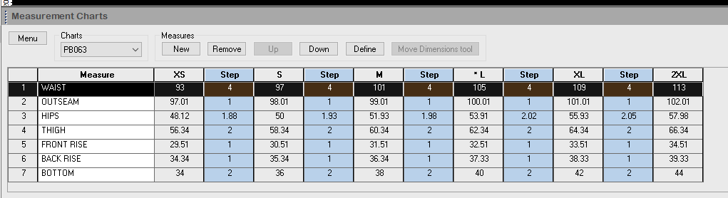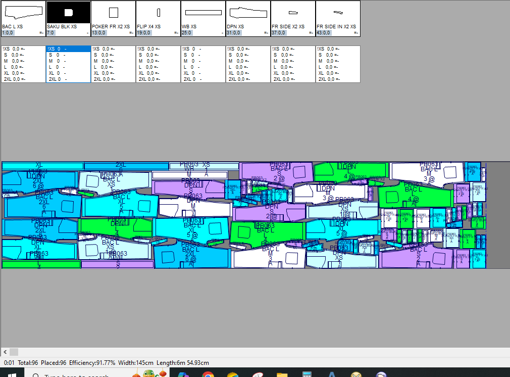 In this example the most efficient use of fabric base on the layout of 6 pattern drawing (sizes: XS, S, M, L, XL, 2XL) is 468cm with efficiency at 87.96%.