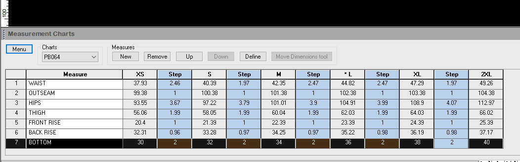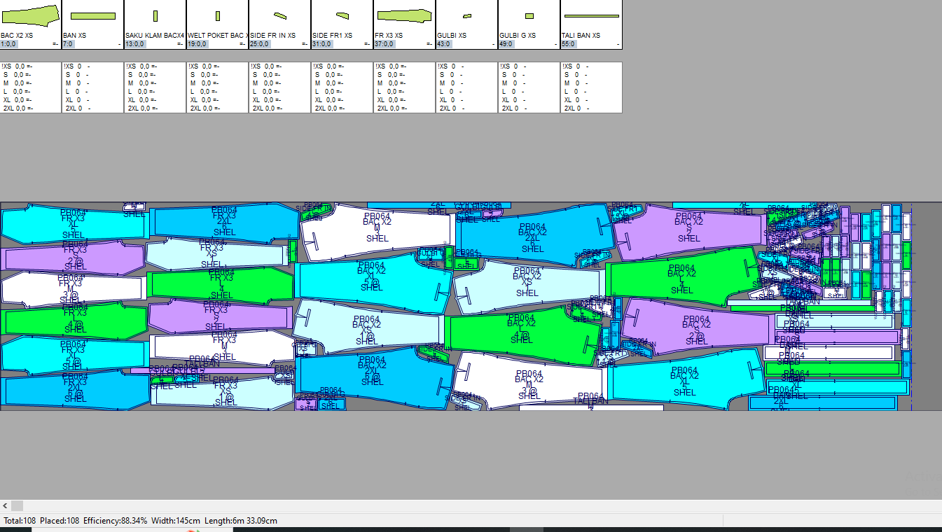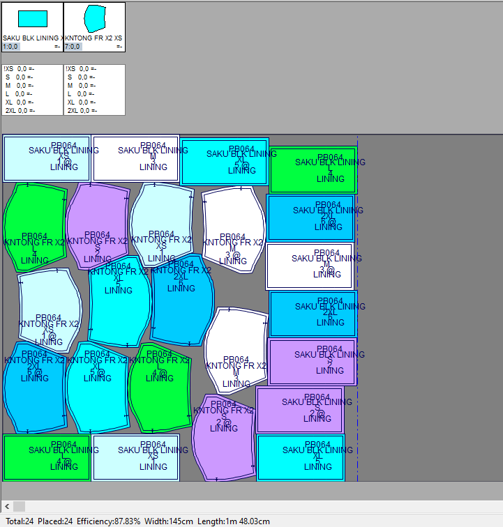 In this example the most efficient use of fabric base on the layout of 6 pattern drawing (sizes: XS, S, M, L, XL, 2XL) is 468cm with efficiency at 87.96%.