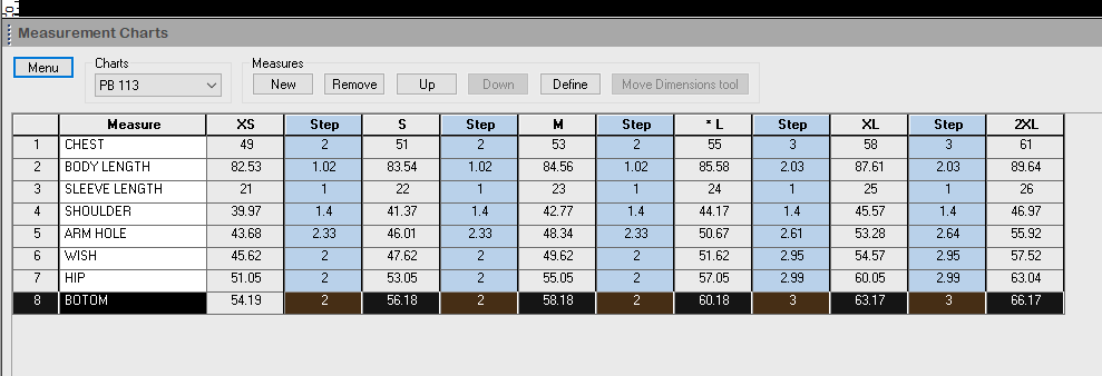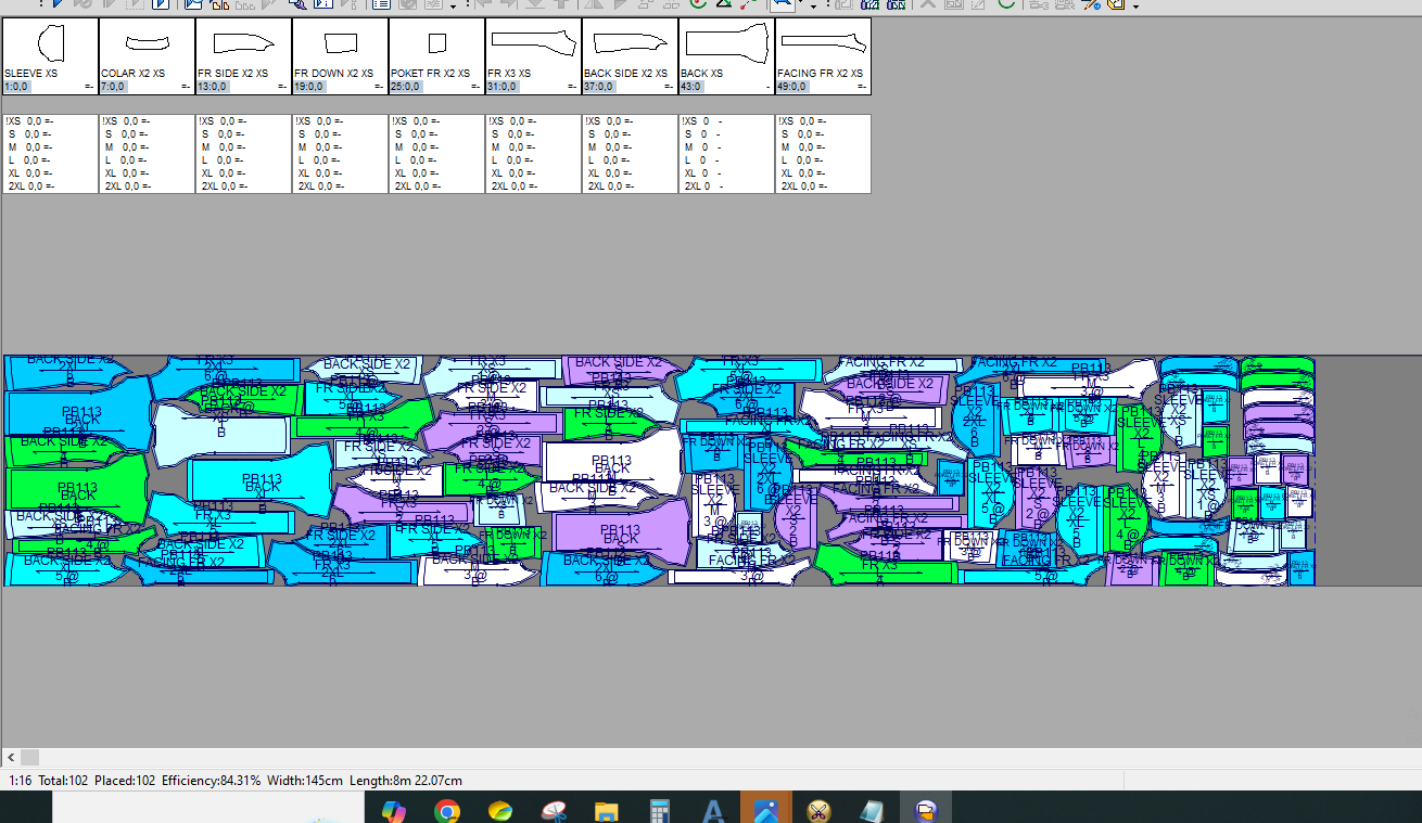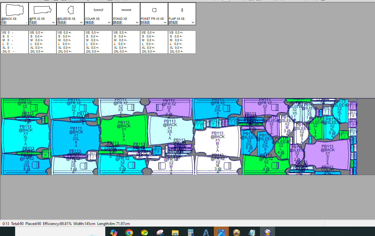 In this example the most efficient use of fabric base on the layout of 6 pattern drawing (sizes: XS, S, M, L, XL, 2XL) is 468cm with efficiency at 87.96%.