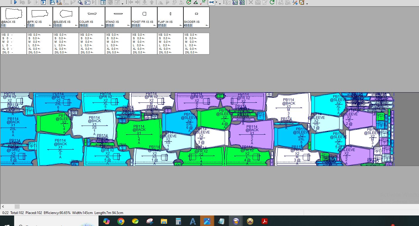 1. Pattern layout is generated automatically using industrial standard nesting algorithm to get the most efficient use of fabric from over 10,000 possible pattern layout.