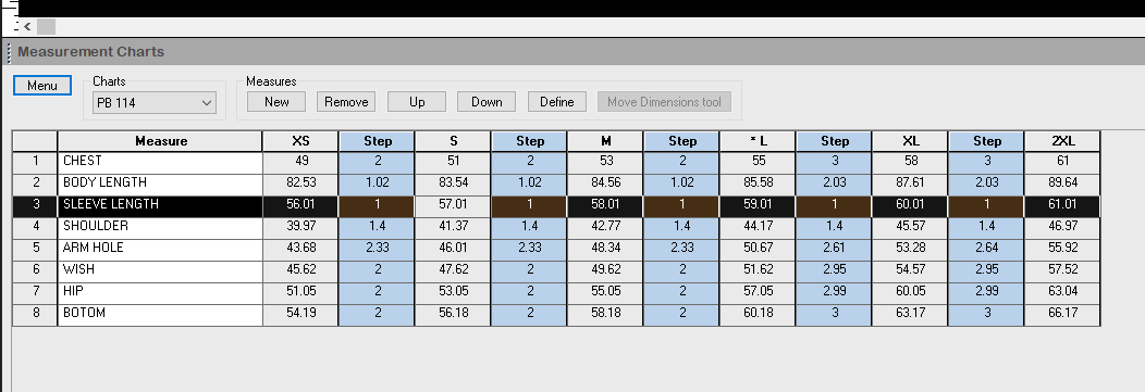 In this example the most efficient use of fabric base on the layout of 6 pattern drawing (sizes: XS, S, M, L, XL, 2XL) is 468cm with efficiency at 87.96%.