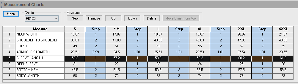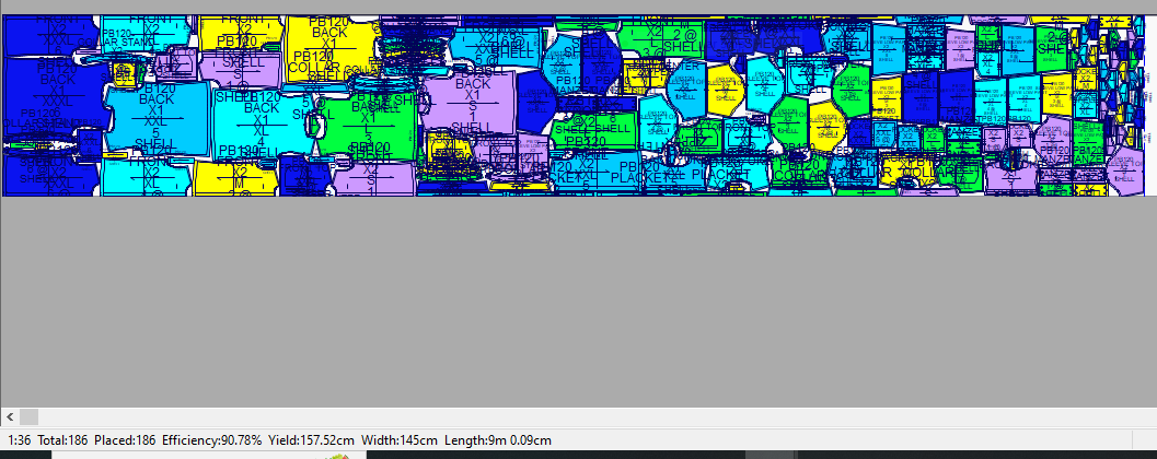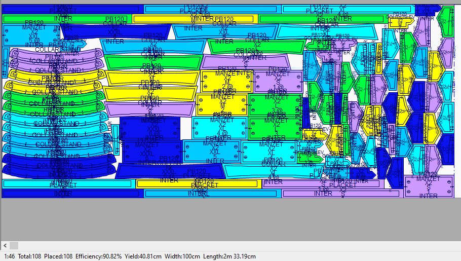 In this example the most efficient use of fabric base on the layout of 6 pattern drawing (sizes: XS, S, M, L, XL, 2XL) is 468cm with efficiency at 87.96%.
