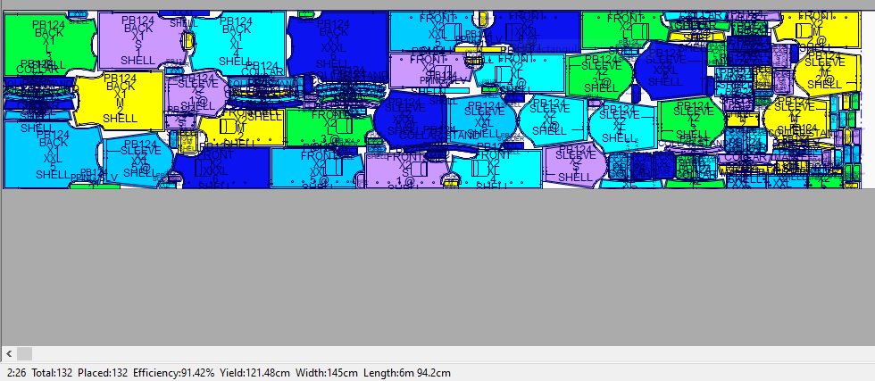In this example the most efficient use of fabric base on the layout of 6 pattern drawing (sizes: XS, S, M, L, XL, 2XL) is 468cm with efficiency at 87.96%.