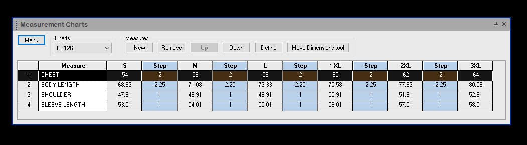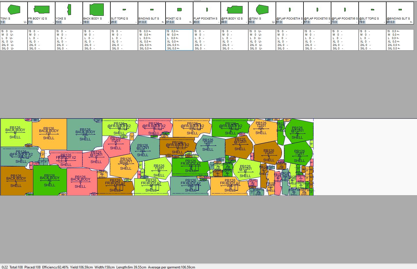 In this example the most efficient use of fabric base on the layout of 6 pattern drawing (sizes: XS, S, M, L, XL, 2XL) is 468cm with efficiency at 87.96%.