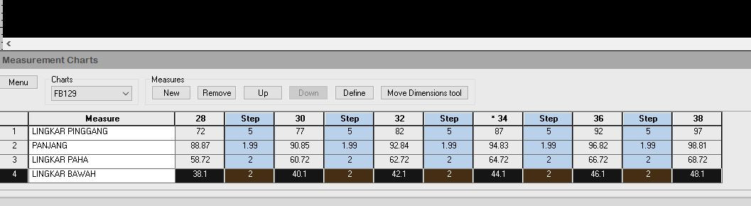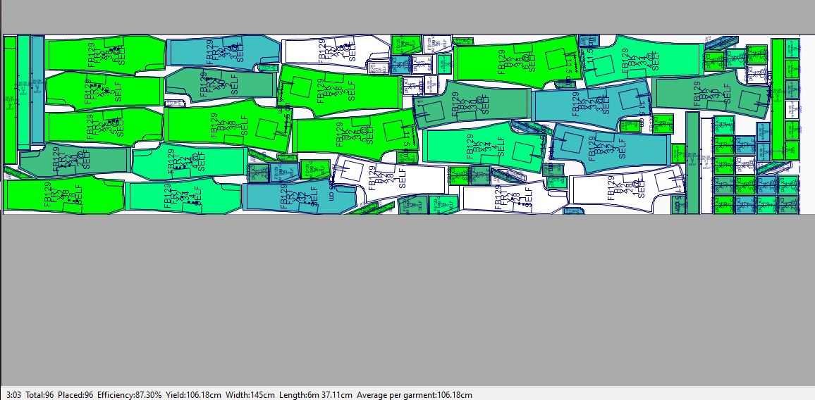 In this example the most efficient use of fabric base on the layout of 6 pattern drawing (sizes: XS, S, M, L, XL, 2XL) is 468cm with efficiency at 87.96%.