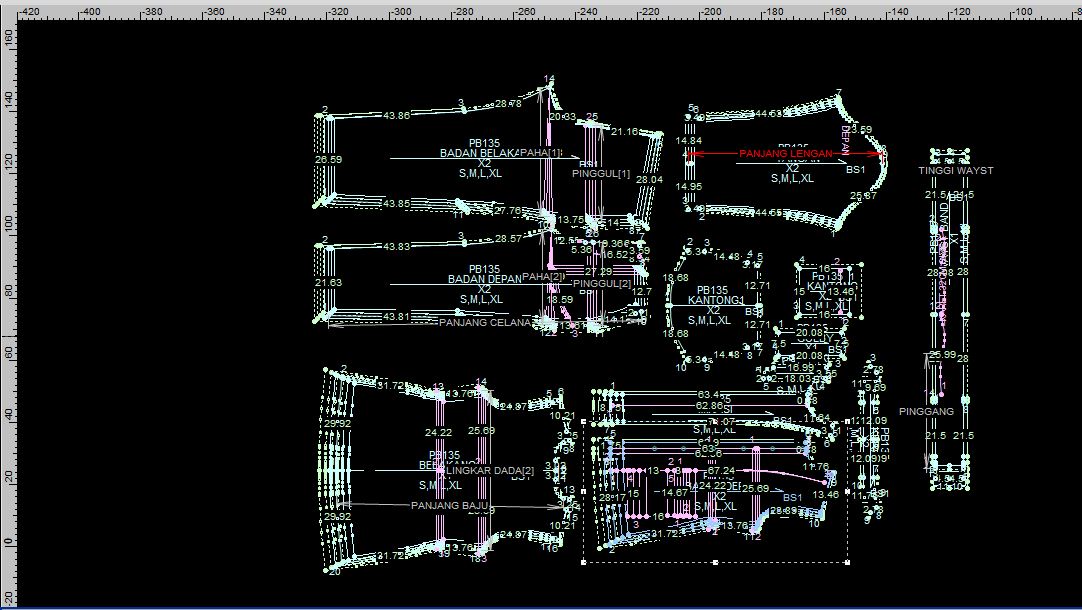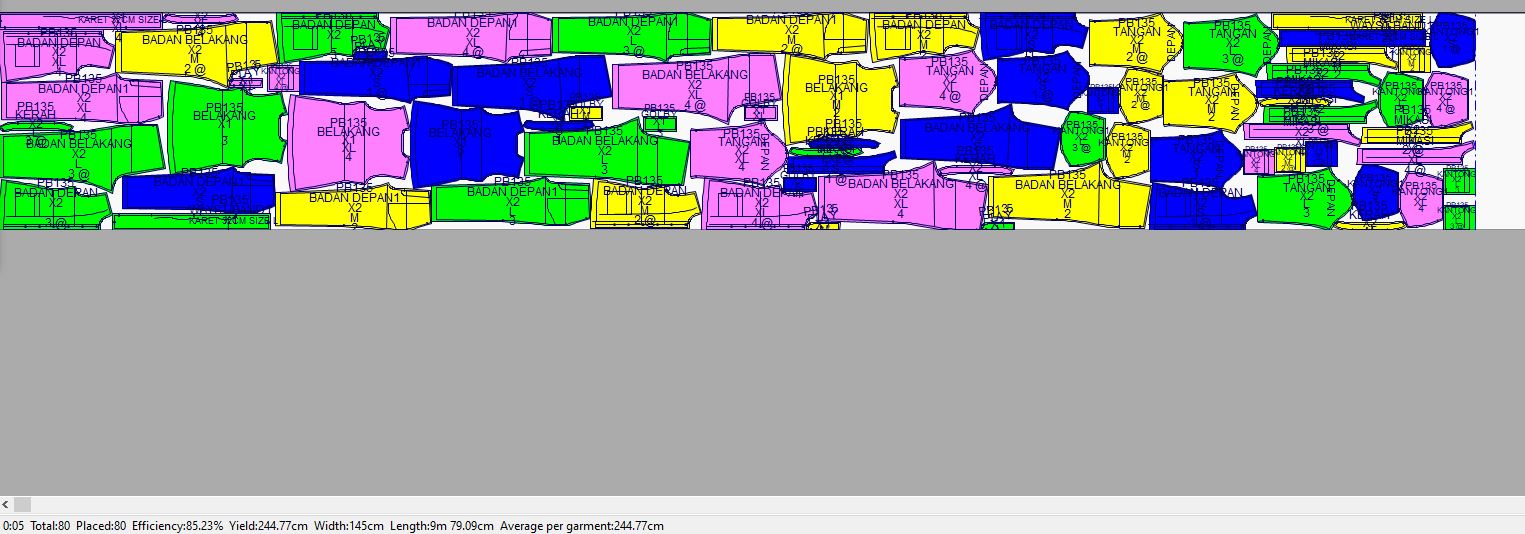 In this example the most efficient use of fabric base on the layout of 6 pattern drawing (sizes: XS, S, M, L, XL, 2XL) is 468cm with efficiency at 87.96%.