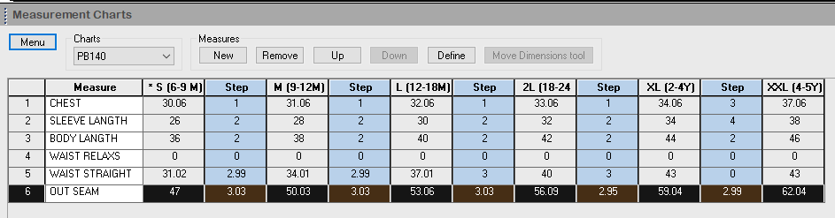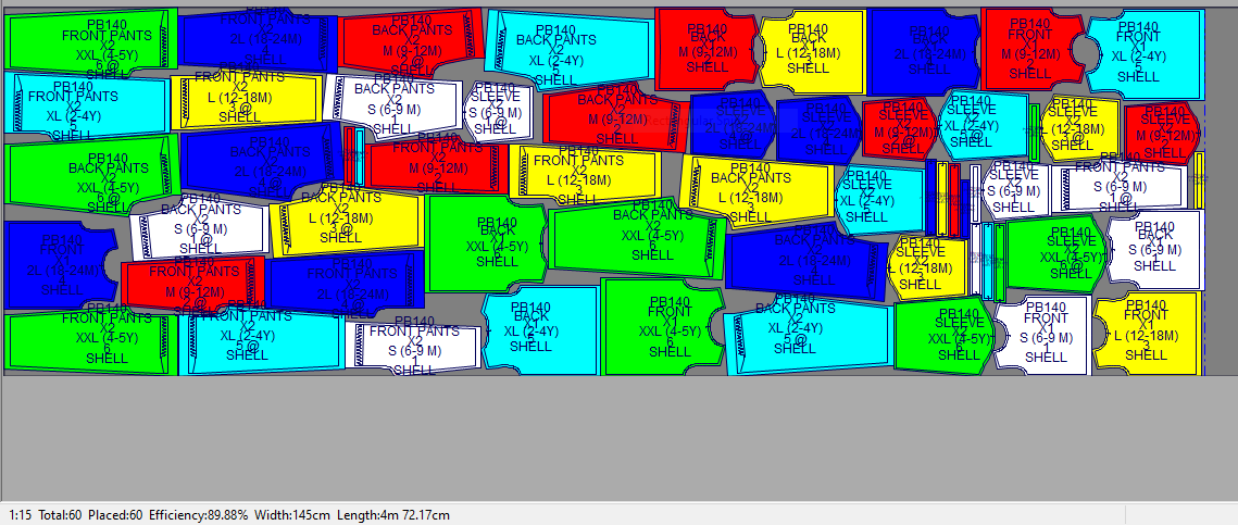 In this example the most efficient use of fabric base on the layout of 6 pattern drawing (sizes: XS, S, M, L, XL, 2XL) is 468cm with efficiency at 87.96%.