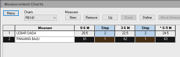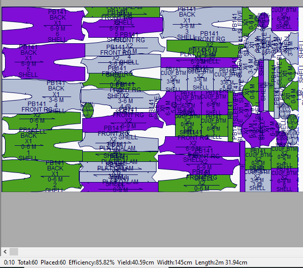 In this example the most efficient use of fabric base on the layout of 6 pattern drawing (sizes: XS, S, M, L, XL, 2XL) is 468cm with efficiency at 87.96%.