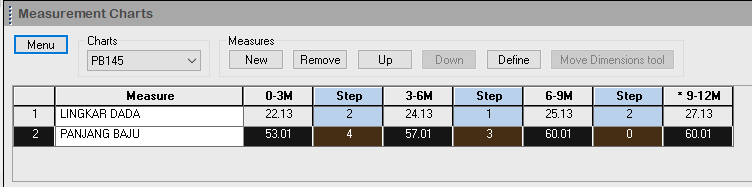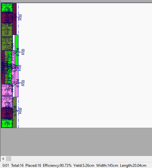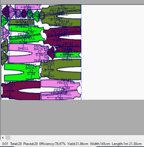 In this example the most efficient use of fabric base on the layout of 6 pattern drawing (sizes: XS, S, M, L, XL, 2XL) is 468cm with efficiency at 87.96%.