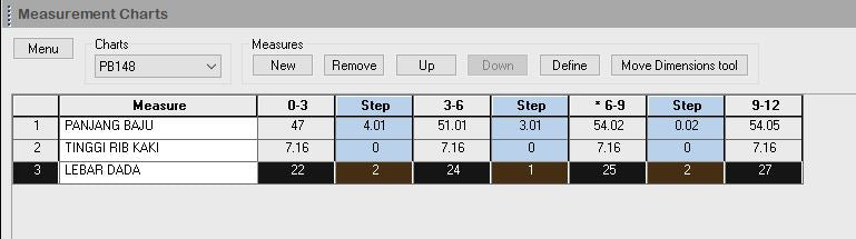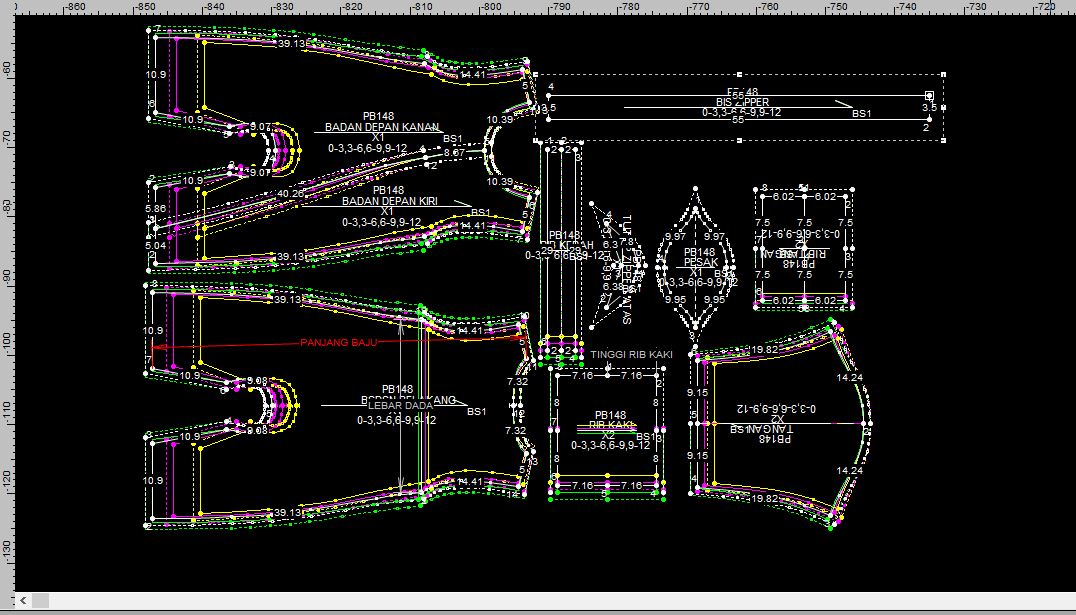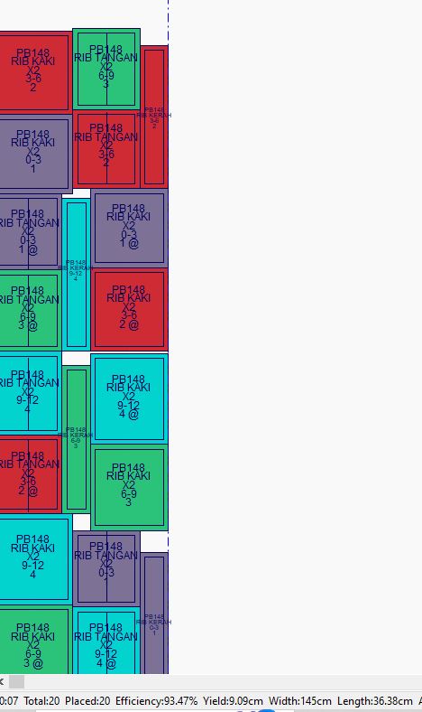 In this example the most efficient use of fabric base on the layout of 6 pattern drawing (sizes: XS, S, M, L, XL, 2XL) is 468cm with efficiency at 87.96%.