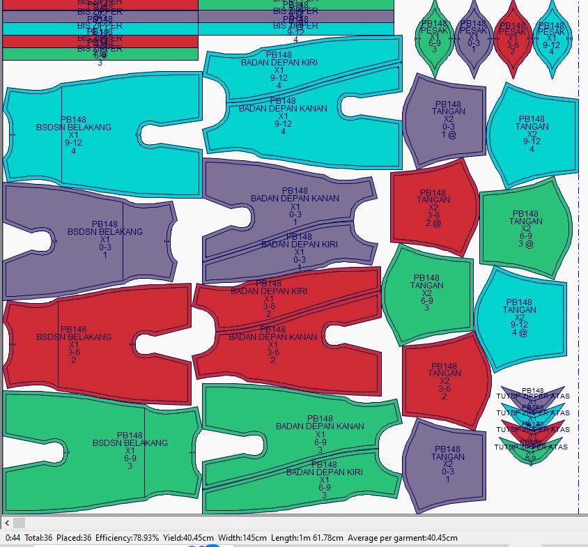 1. Pattern layout is generated automatically using industrial standard nesting algorithm to get the most efficient use of fabric from over 10,000 possible pattern layout.