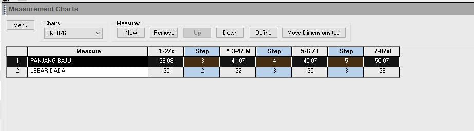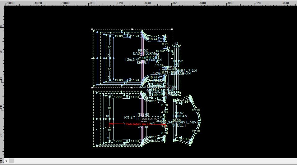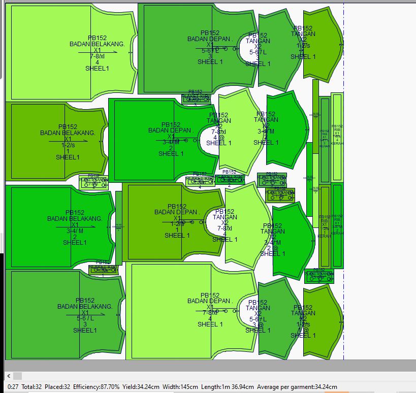 In this example the most efficient use of fabric base on the layout of 6 pattern drawing (sizes: XS, S, M, L, XL, 2XL) is 468cm with efficiency at 87.96%.