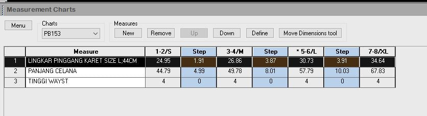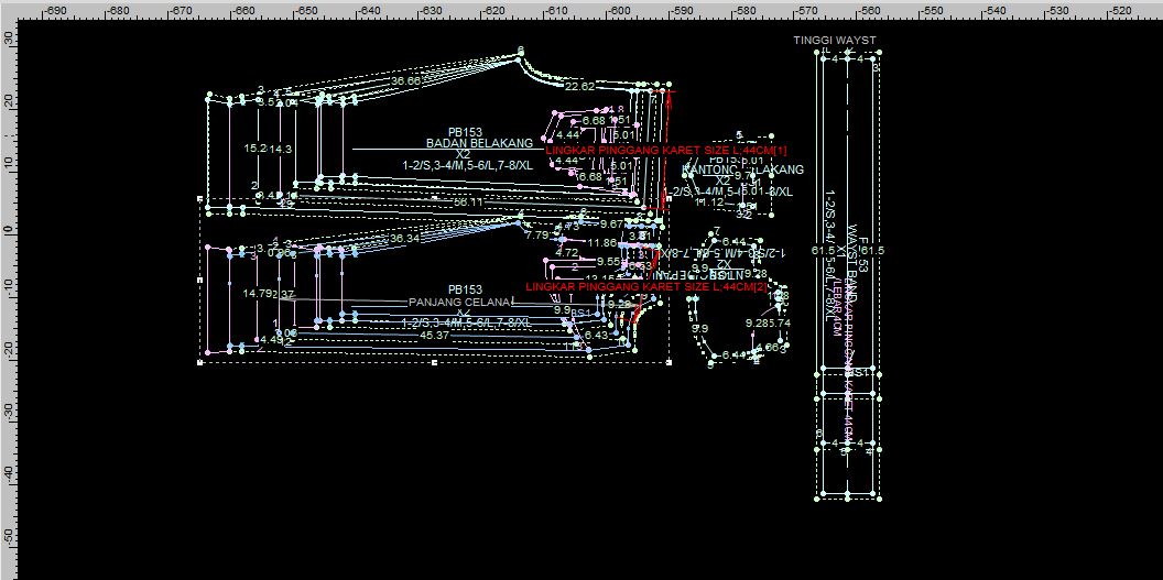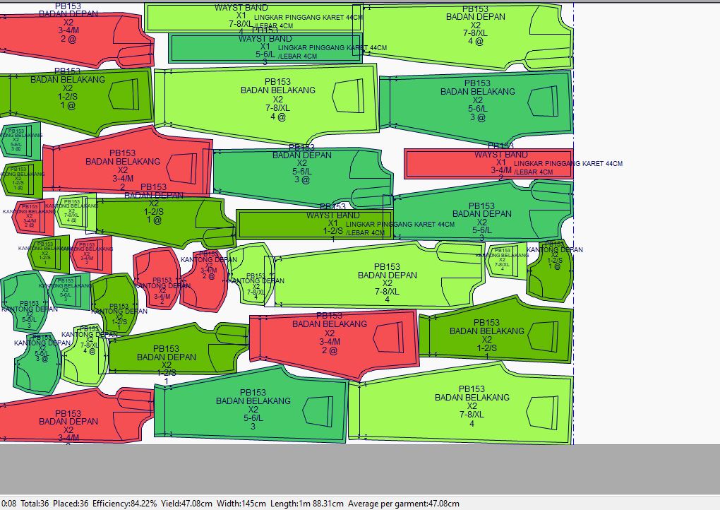 In this example the most efficient use of fabric base on the layout of 6 pattern drawing (sizes: XS, S, M, L, XL, 2XL) is 468cm with efficiency at 87.96%.