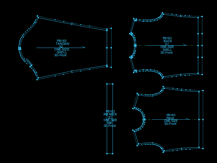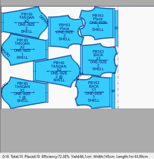 In this example the most efficient use of fabric base on the layout of 6 pattern drawing (sizes: XS, S, M, L, XL, 2XL) is 468cm with efficiency at 87.96%.
