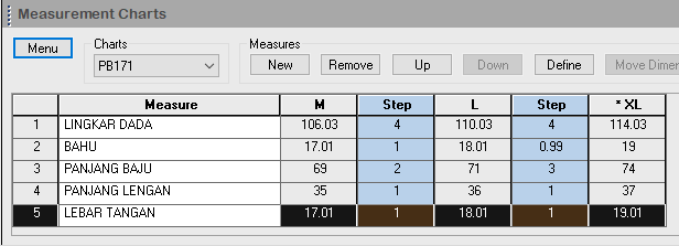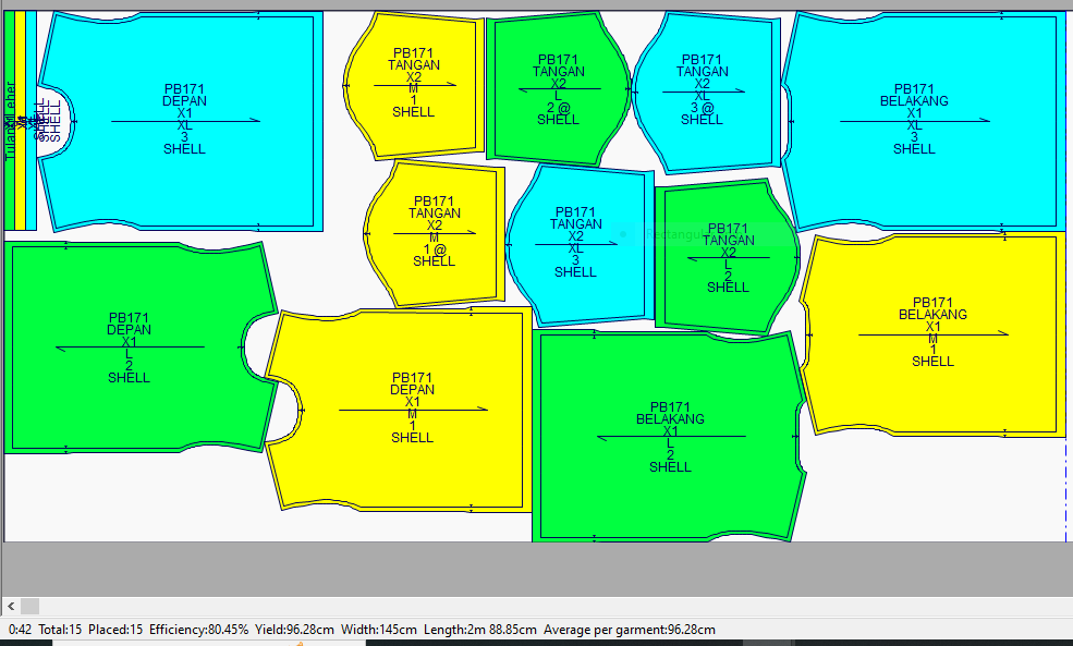 In this example the most efficient use of fabric base on the layout of 6 pattern drawing (sizes: XS, S, M, L, XL, 2XL) is 468cm with efficiency at 87.96%.