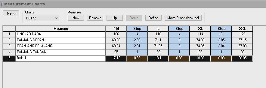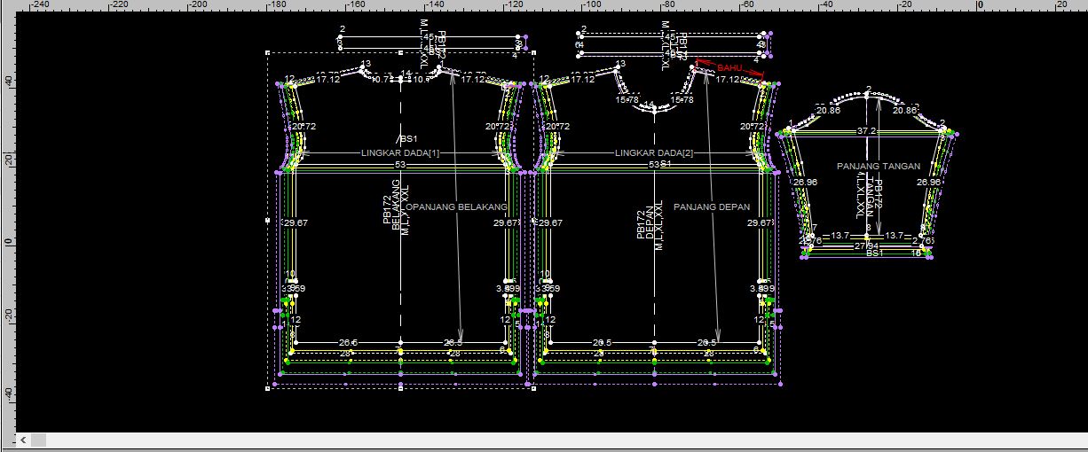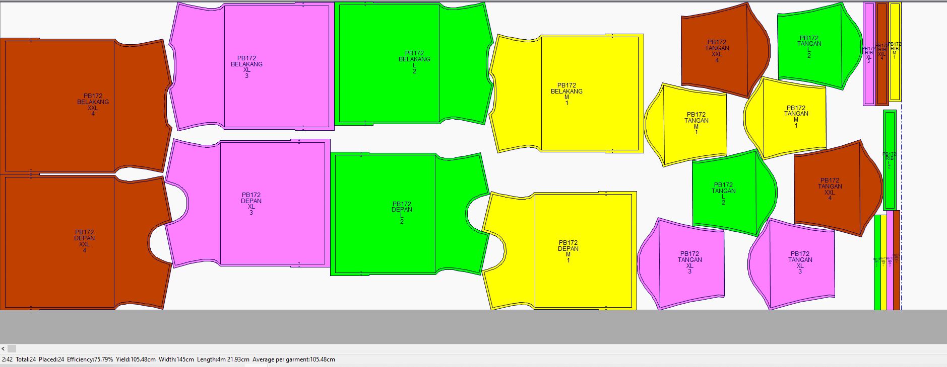 In this example the most efficient use of fabric base on the layout of 6 pattern drawing (sizes: XS, S, M, L, XL, 2XL) is 468cm with efficiency at 87.96%.
