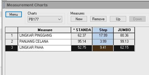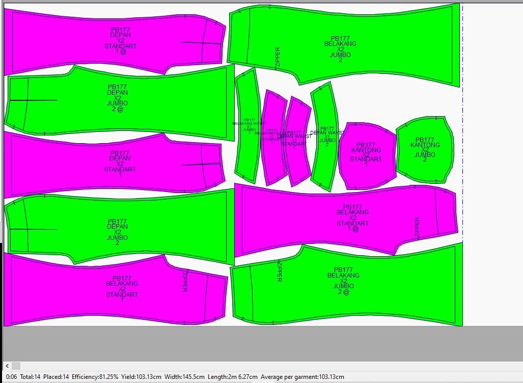 In this example the most efficient use of fabric base on the layout of 6 pattern drawing (sizes: XS, S, M, L, XL, 2XL) is 468cm with efficiency at 87.96%.