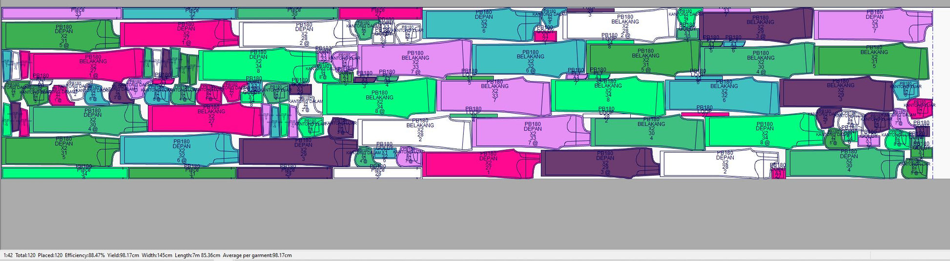 In this example the most efficient use of fabric base on the layout of 6 pattern drawing (sizes: XS, S, M, L, XL, 2XL) is 468cm with efficiency at 87.96%.