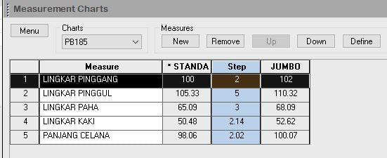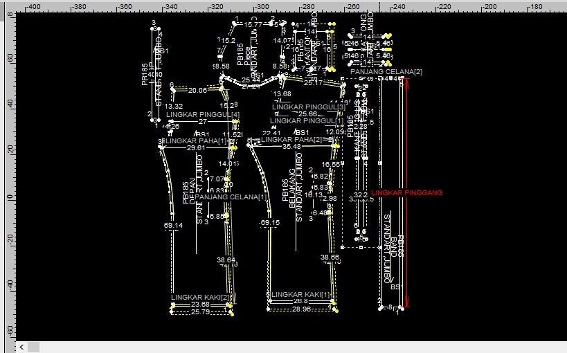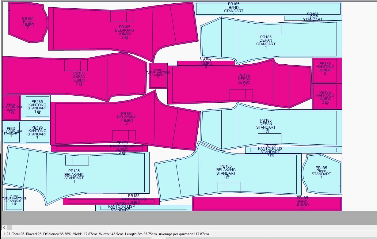 In this example the most efficient use of fabric base on the layout of 6 pattern drawing (sizes: XS, S, M, L, XL, 2XL) is 468cm with efficiency at 87.96%.