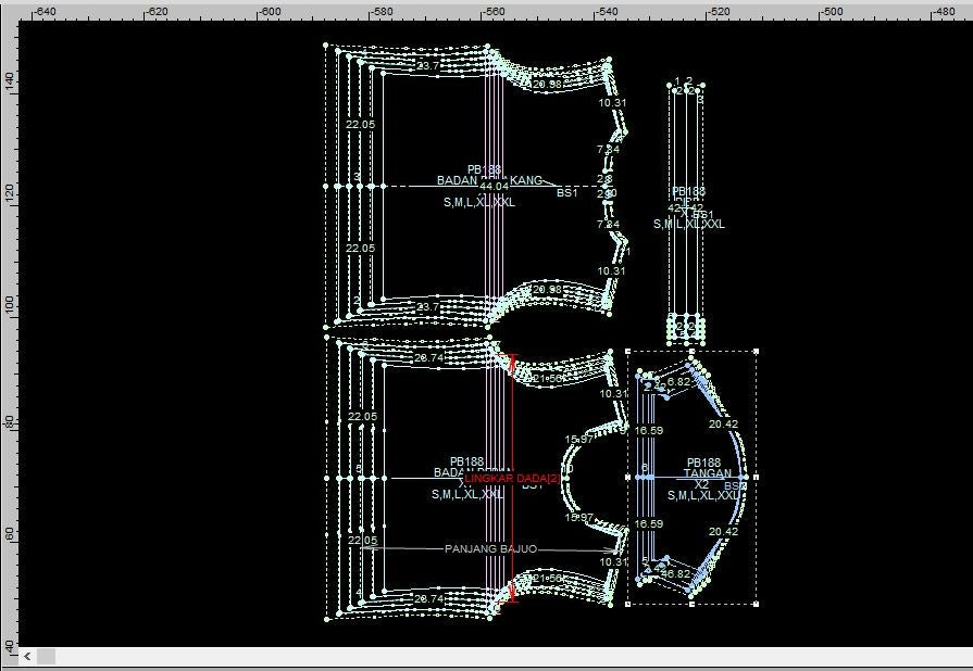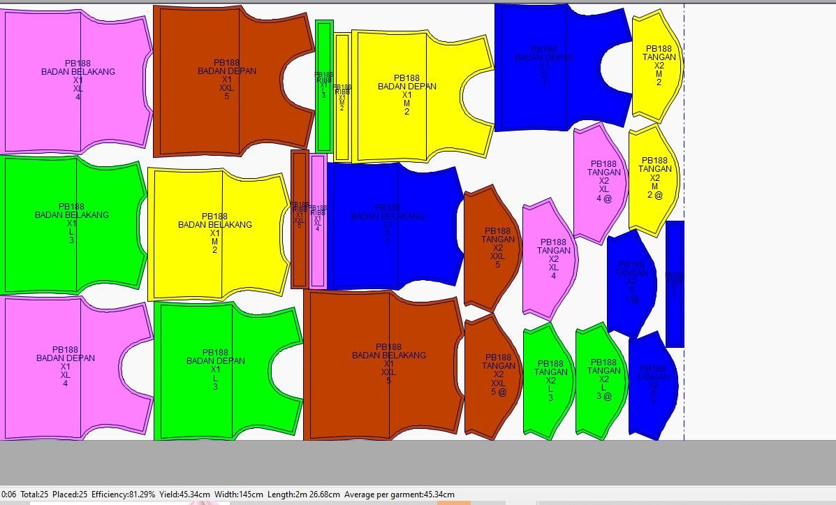 In this example the most efficient use of fabric base on the layout of 6 pattern drawing (sizes: XS, S, M, L, XL, 2XL) is 468cm with efficiency at 87.96%.