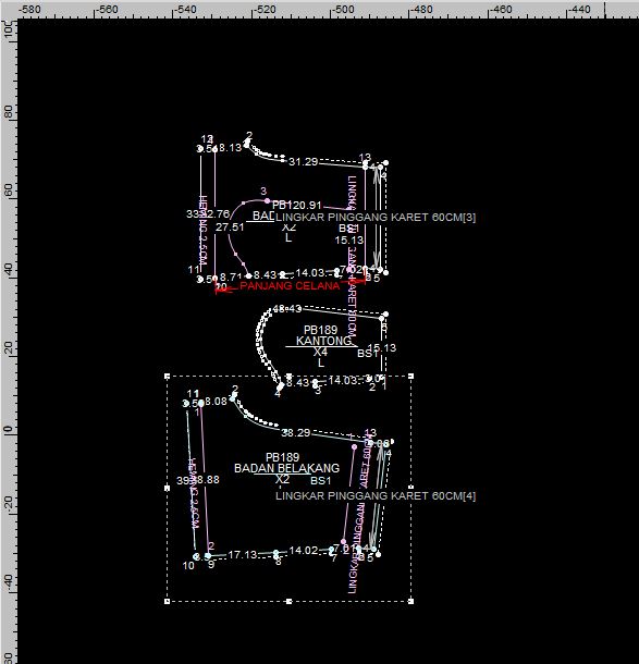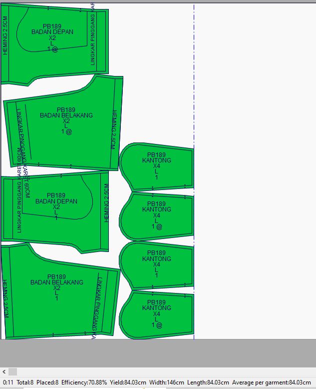 In this example the most efficient use of fabric base on the layout of 6 pattern drawing (sizes: XS, S, M, L, XL, 2XL) is 468cm with efficiency at 87.96%.