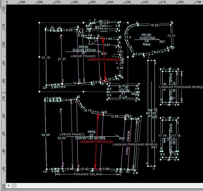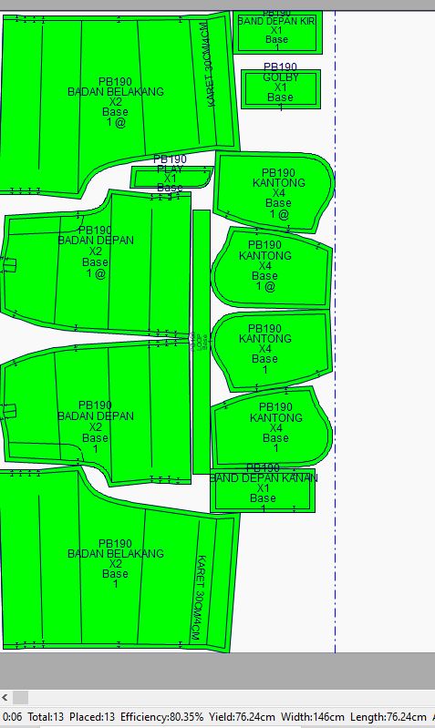 In this example the most efficient use of fabric base on the layout of 6 pattern drawing (sizes: XS, S, M, L, XL, 2XL) is 468cm with efficiency at 87.96%.