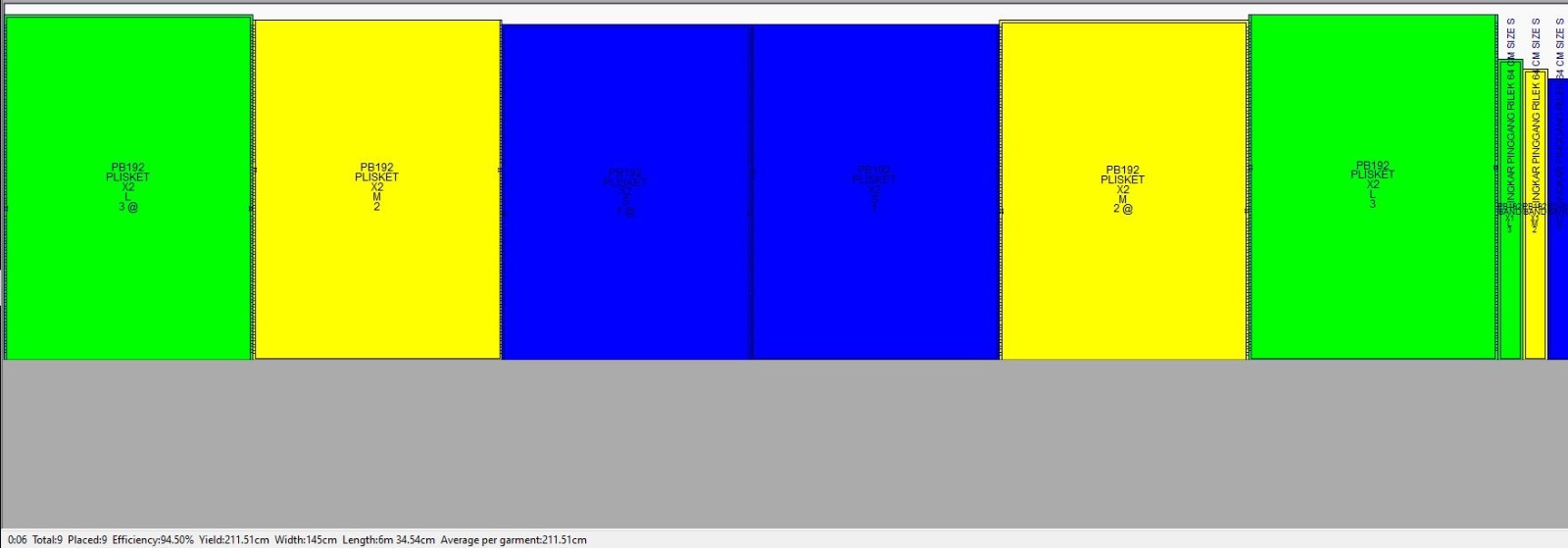 In this example the most efficient use of fabric base on the layout of 6 pattern drawing (sizes: XS, S, M, L, XL, 2XL) is 468cm with efficiency at 87.96%.