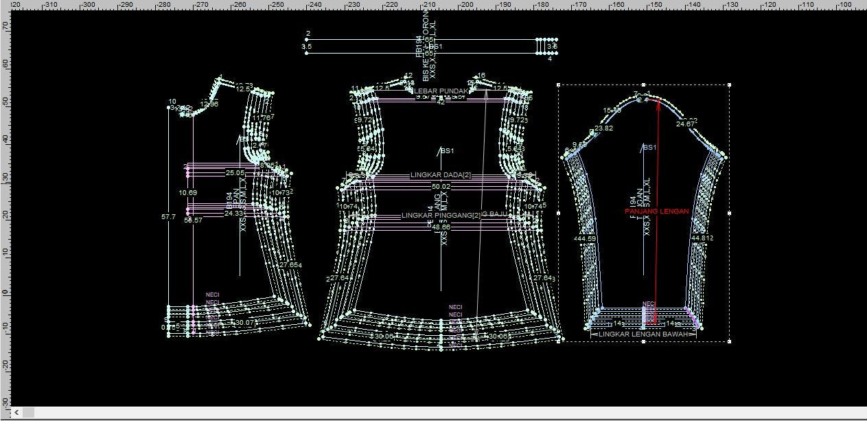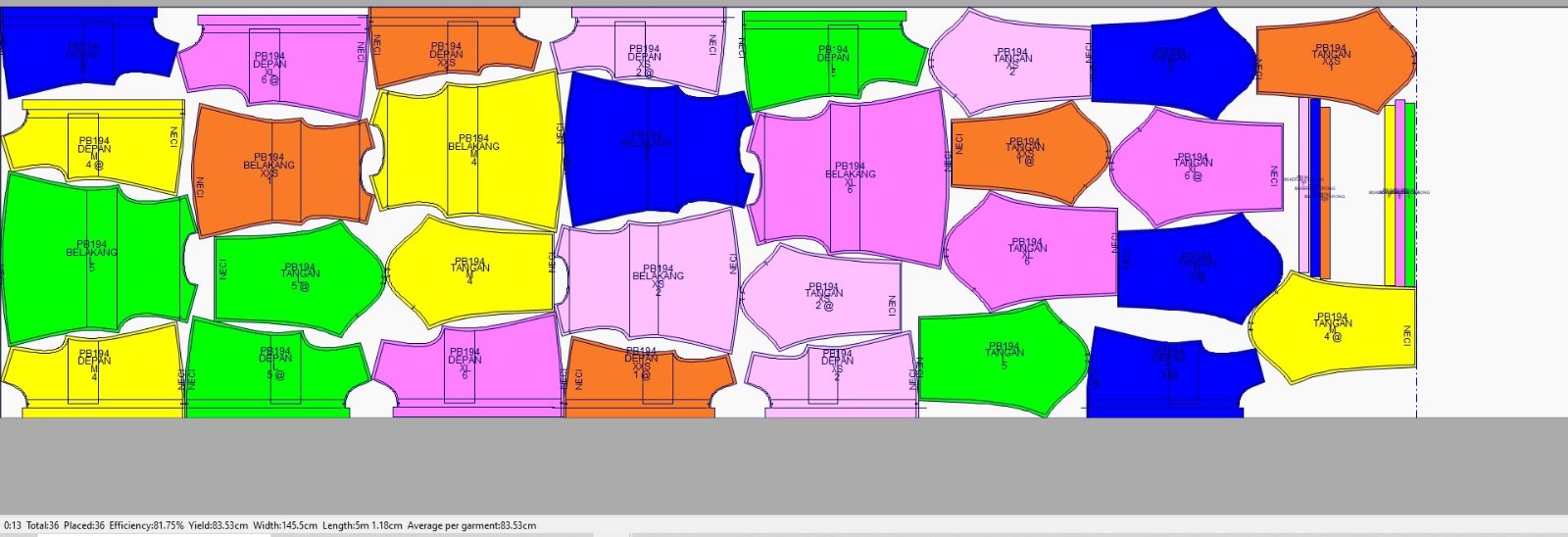 In this example the most efficient use of fabric base on the layout of 6 pattern drawing (sizes: XS, S, M, L, XL, 2XL) is 468cm with efficiency at 87.96%.