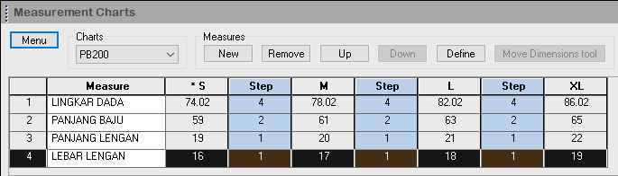 In this example the most efficient use of fabric base on the layout of 6 pattern drawing (sizes: XS, S, M, L, XL, 2XL) is 468cm with efficiency at 87.96%.