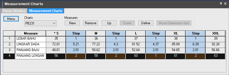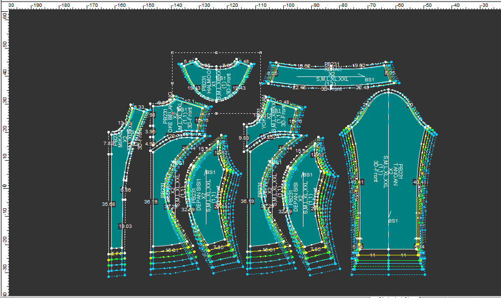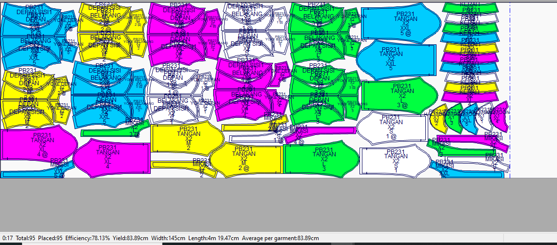 In this example the most efficient use of fabric base on the layout of 6 pattern drawing (sizes: XS, S, M, L, XL, 2XL) is 468cm with efficiency at 87.96%.